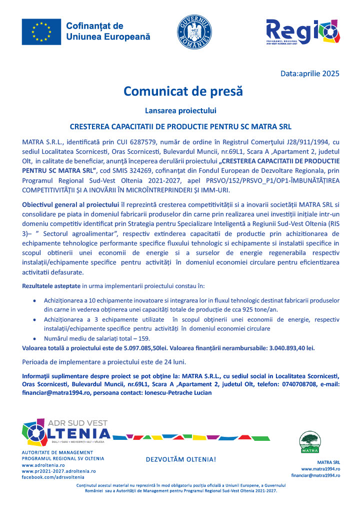 „CRESTEREA CAPACITATII DE PRODUCTIE PENTRU SC MATRA SRL”,